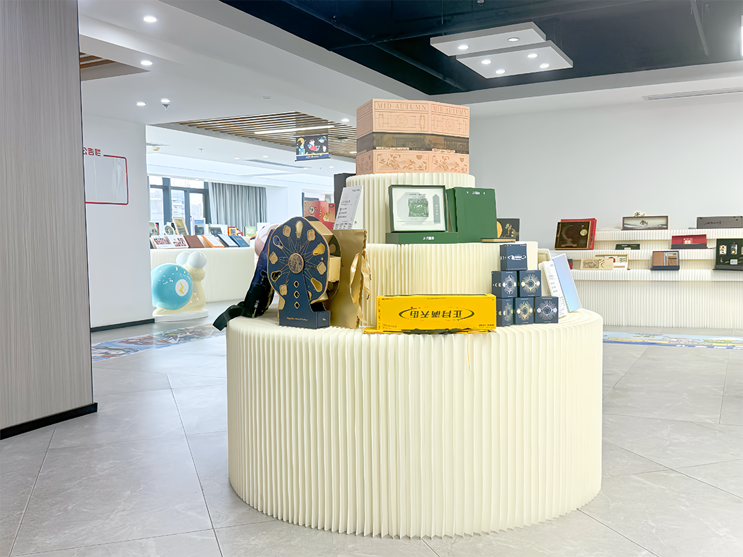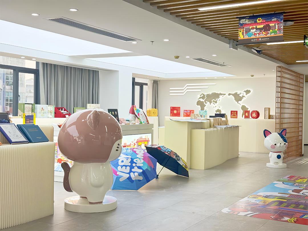 步入展厅,开放式的布局瞬间拉近了与参观者的体验距离,无需刻意规划路线,便可自由穿梭在文化创意的海洋中。最引人注目的当属特色风琴纸艺展架,其设计灵感源自蜂巢结构,不仅造型如画卷般舒展雅致,更将环保理念与艺术表达巧妙融合,每一件展品置于其上,都被晕染出独特的艺术气息,成为展厅内一道灵动的风景线。展厅的场景化布置更显匠心。自有 IP “夏格拉斯” 与 “非常家族”系列人偶装置憨态可掬,或立于展架旁,或藏在转角处,仿佛在与参观者互动;色彩鲜艳的道旗主题与地贴相互呼应,将各个展示区域串联起来,构建出一个充满活力的文化磁场。文艺气质与卡通趣味在此碰撞,让身处其中的人不自觉沉醉于这份独特的沉浸氛围。