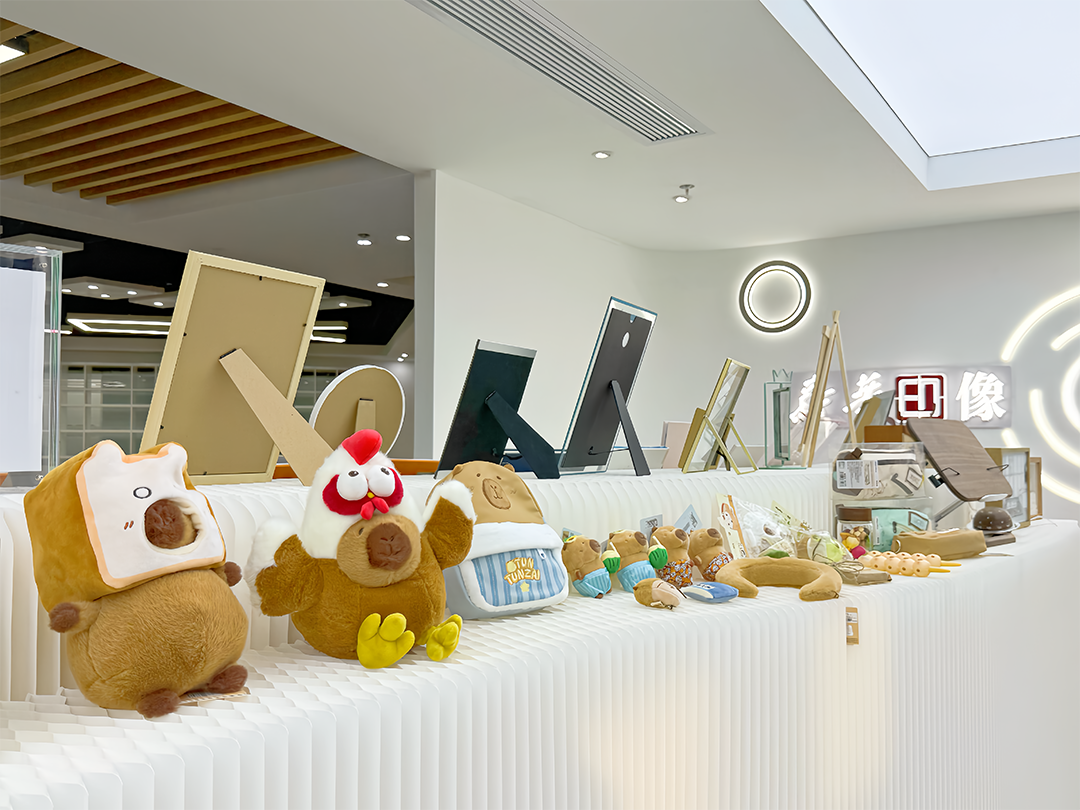 展厅内三大主题区域各具风韵,却又浑然一体,全方位展现文化创意的多元魅力。礼盒展示区里,一款款文创礼盒从外包装设计到内在产品搭配都尽显匠心,无论是节日馈赠还是个人收藏,都能找到适配的选择;照片影像区则是 “时光的容器”,这里涵盖相片打印、毕业相册定制、亲子相册制作以及艺术画框装裱等服务,一张张照片、一本本相册,将生活中的珍贵瞬间定格成永恒;文创产品展示区更是琳琅满目,自有 IP 衍生品贯穿生活方方面面 —— 融合实用与美学的笔记本、印有可爱 IP 形象的服饰、兼具功能性与设计感的雨伞等一应俱全,更有围绕地域文化特色与非遗传承开发的专属文创产品,让文化创意真正融入生活美学,助力人文精神代代相传。