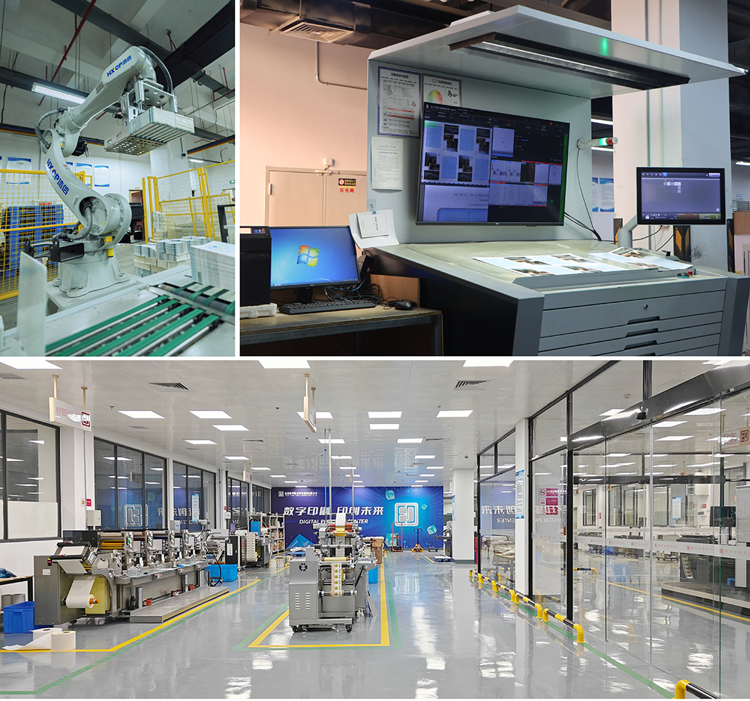 码垛机械臂(左上)智能在线检测设备(右上)数字印刷中心(下)