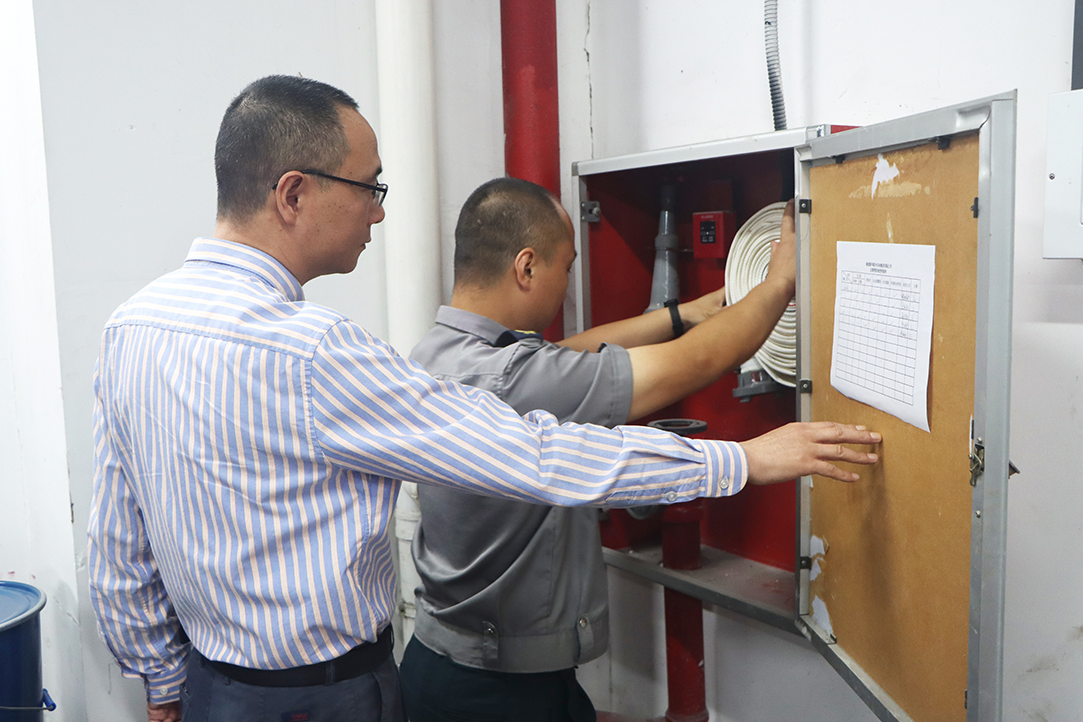 物业管理人员检查车间消防设备